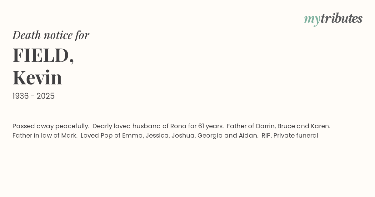 12°CPassed away peacefully. Dearly loved husband of Rona for 61 years. Father of Darrin, Bruce and Karen. Father in law of Mark. Loved Pop of Emma, Jessica, Joshua, Georgia and Aidan. RIP. Private funeral