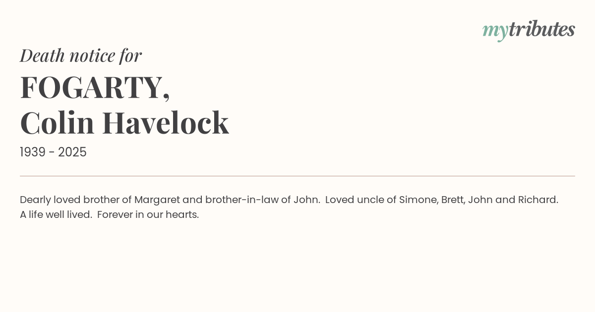12°CDearly loved brother of Margaret and brother-in-law of John. Loved uncle of Simone, Brett, John and Richard. A life well lived. Forever in our hearts.
