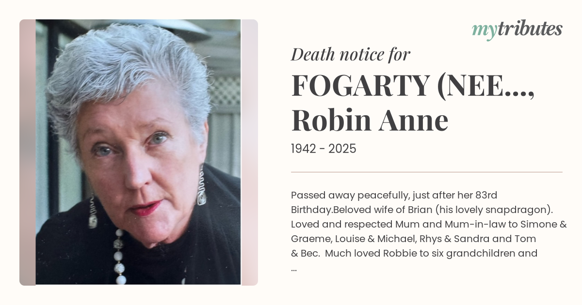 Beloved wife of Brian (his lovely snapdragon). Loved and respected Mum and Mum-in-law to Simone & Graeme, Louise & Michael, Rhys & Sandra and Tom & Bec. Much loved “Robbie” to six grandchildren and partners. Loving big sister to Pauline, Carmel, Peter (dec), Mary and Tony, their partners, and a fantastic Auntie to 17 nieces and nephews and their families. A dear friend to too many to name.