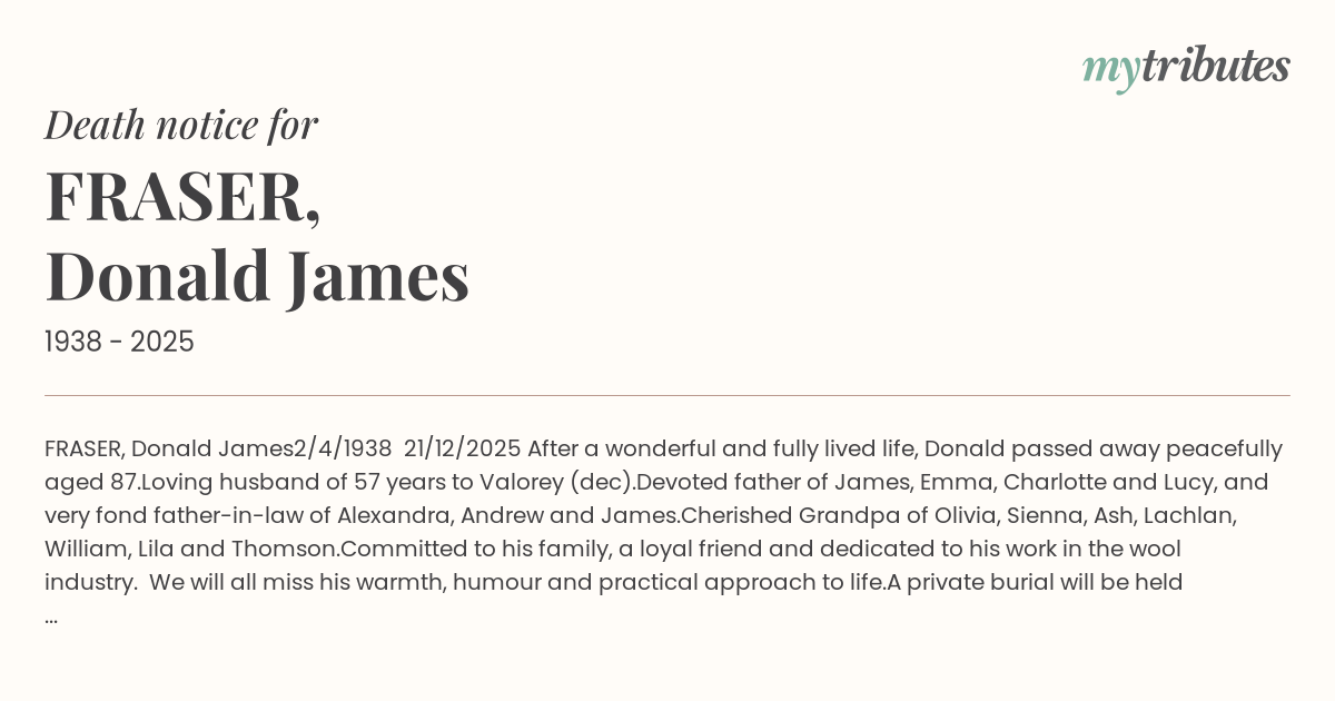 A memorial to celebrate Donald’s life to be advised in the new year.