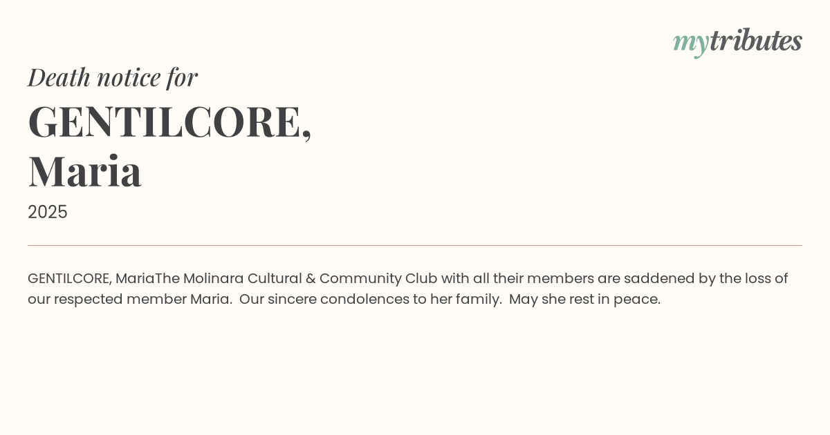 The Molinara Cultural & Community Club with all their members are saddened by the loss of our respected member Maria. Our sincere condolences to her family. May she rest in peace.