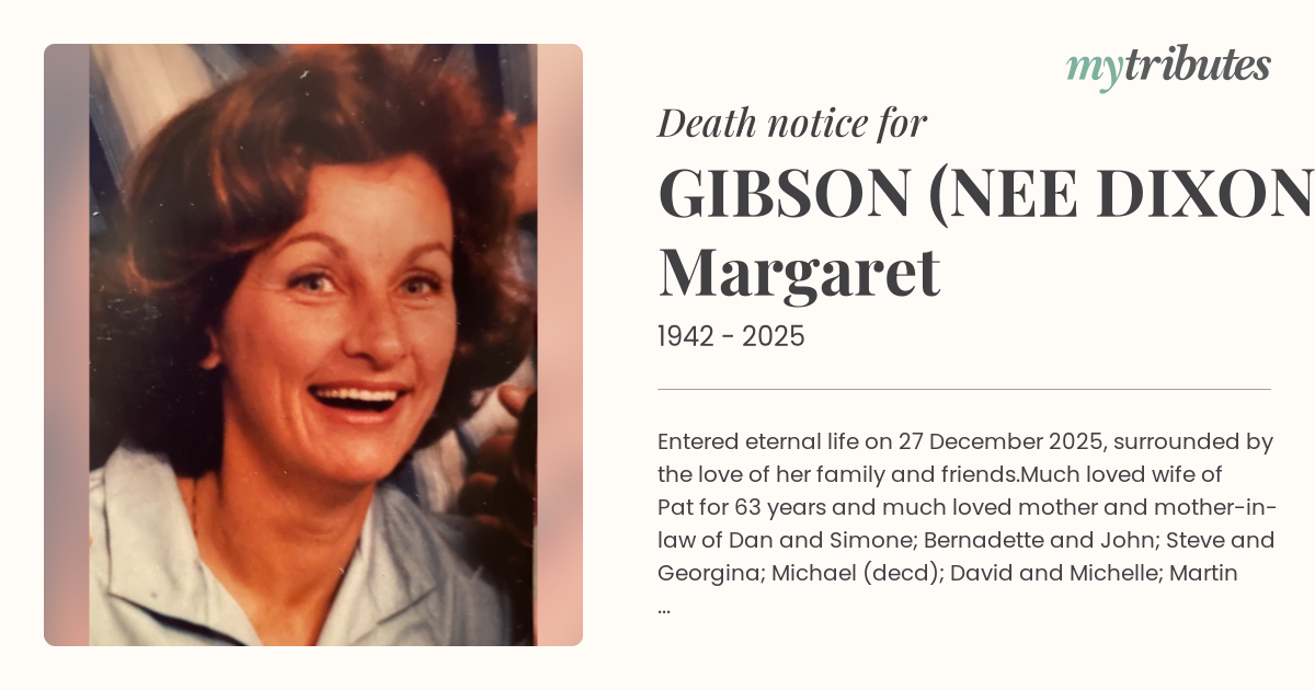 12°CEntered eternal life on 27 December 2025, surrounded by the love of her family and friends.