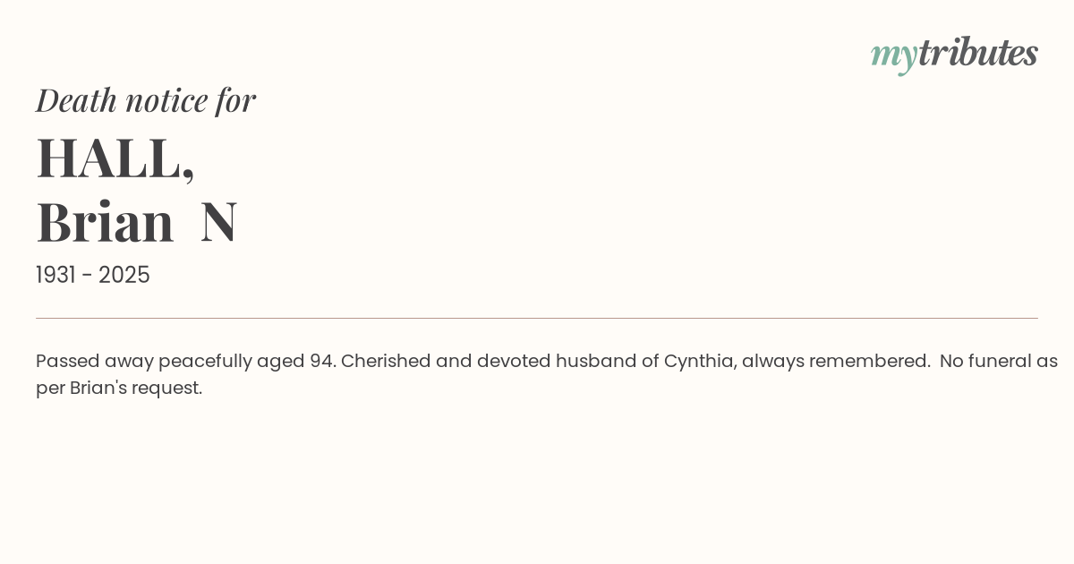 12°CPassed away peacefully aged 94. Cherished and devoted husband of Cynthia, always remembered. No funeral as per Brian's request.