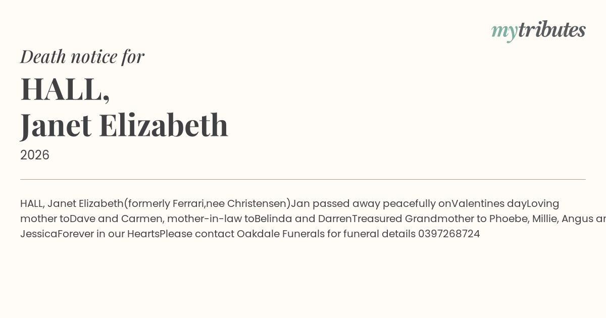 Please contact Oakdale Funerals for funeral details 03972...