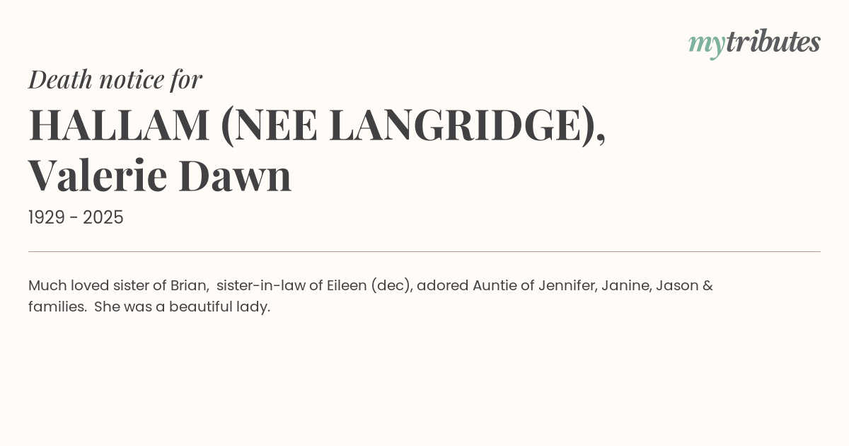 12°CMuch loved sister of Brian, sister-in-law of Eileen (dec), adored Auntie of Jennifer, Janine, Jason & families. She was a beautiful lady.