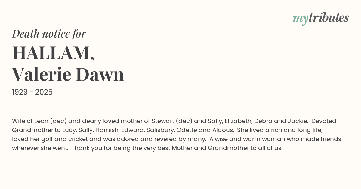 12°CWife of Leon (dec) and dearly loved mother of Stewart (dec) and Sally, Elizabeth, Debra and Jackie. Devoted Grandmother to Lucy, Sally, Hamish, Edward, Salisbury, Odette and Aldous. She lived a rich and long life, loved her golf and cricket and was adored and revered by many. A wise and warm woman who made friends wherever she went. Thank you for being the very best Mother and Grandmother to all of us.