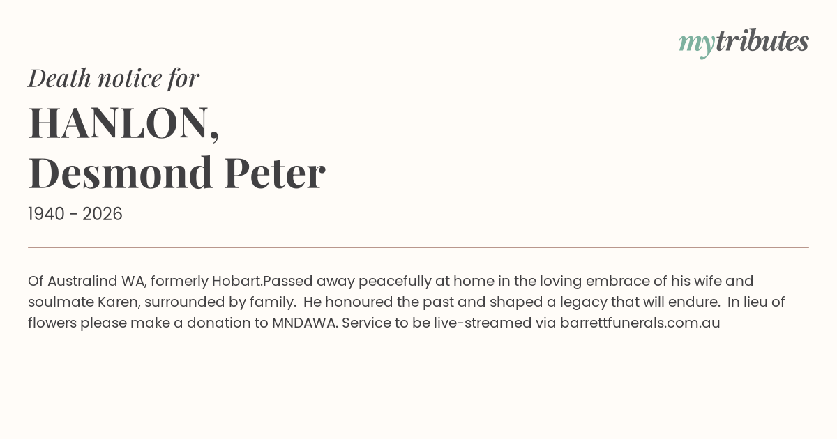 Passed away peacefully at home in the loving embrace of his wife and soulmate Karen, surrounded by family. He honoured the past and shaped a legacy that will endure.