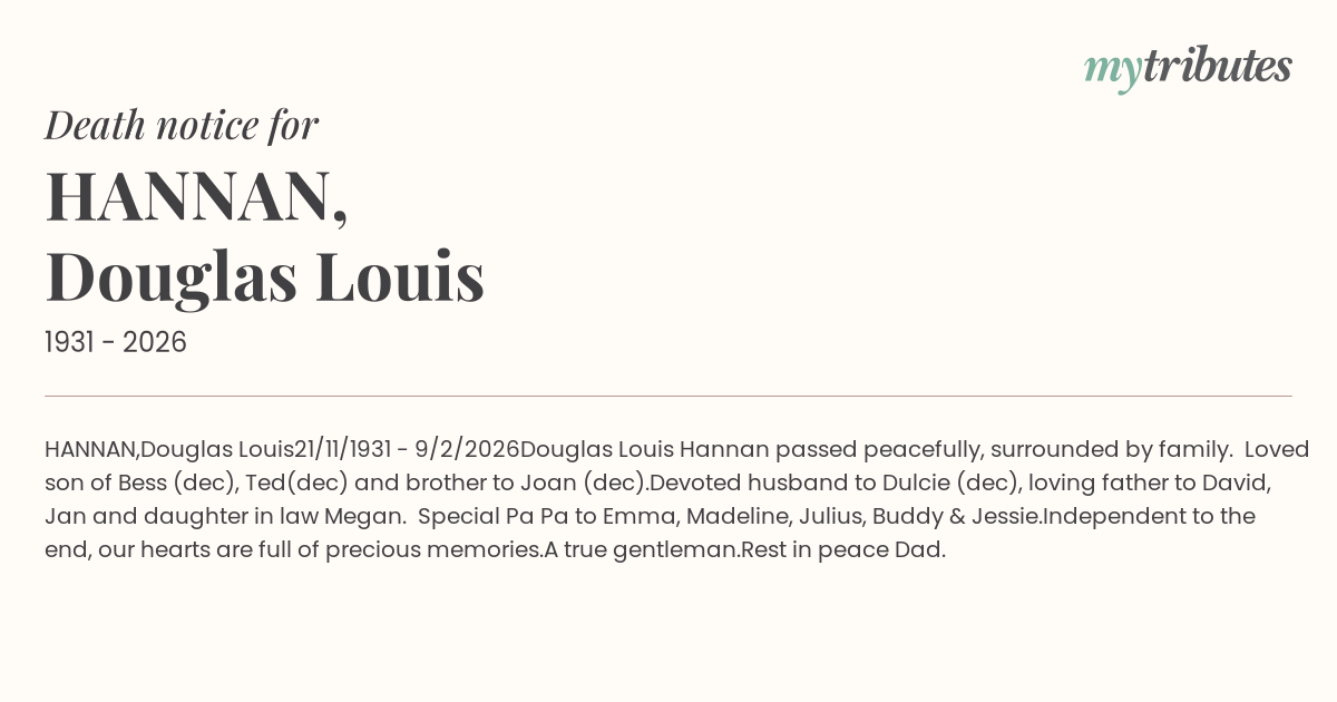Douglas Louis Hannan passed peacefully, surrounded by family. Loved son of Bess (dec), Ted(dec) and brother to Joan (dec).
