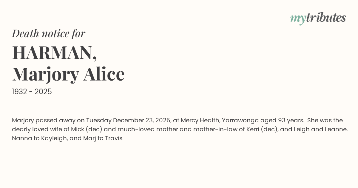 12°CMarjory passed away on Tuesday December 23, 2025, at Mercy Health, Yarrawonga aged 93 years. She was the dearly loved wife of Mick (dec) and much-loved mother and mother-in-law of Kerri (dec), and Leigh and Leanne. Nanna to Kayleigh, and Marj to Travis.