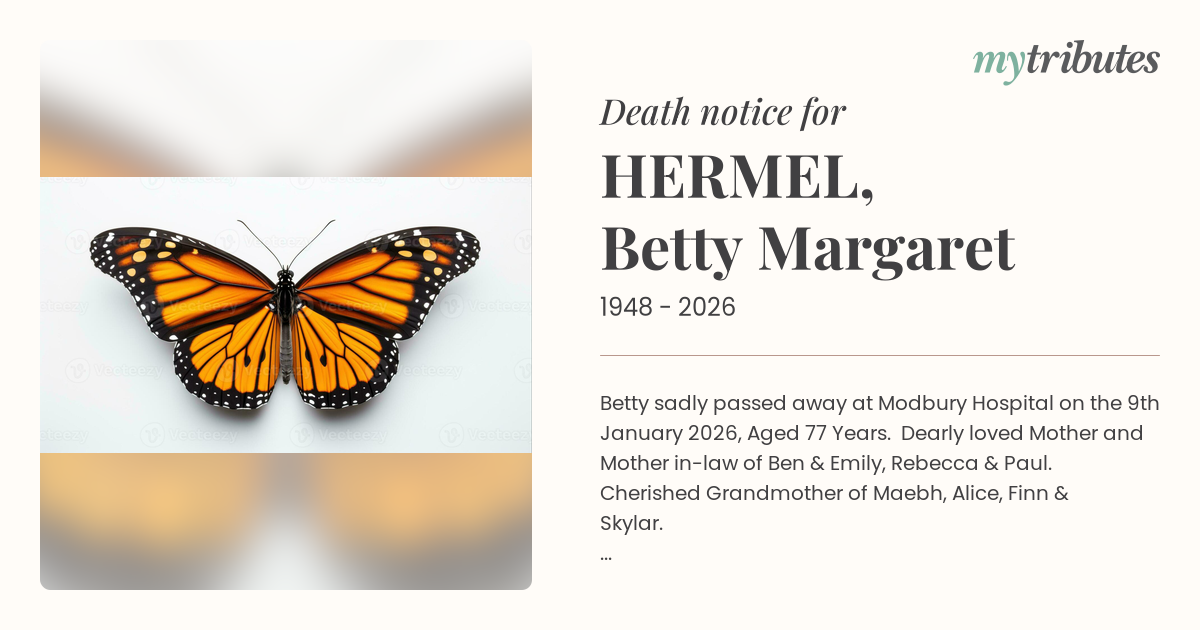 12°CBetty sadly passed away at Modbury Hospital on the 9th January 2026, Aged 77 Years. Dearly loved Mother and Mother in-law of Ben & Emily, Rebecca & Paul. Cherished Grandmother of Maebh, Alice, Finn & Skylar. Loved by all.