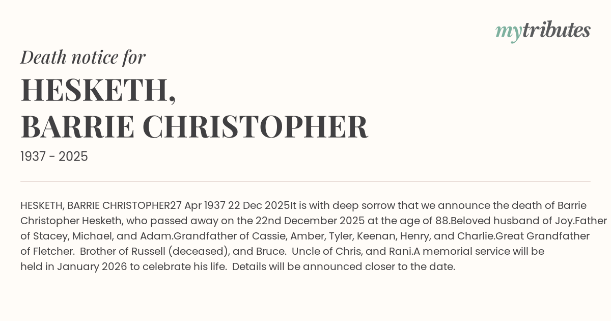 It is with deep sorrow that we announce the death of Barrie Christopher Hesketh, who passed away on the 22nd December 2025 at the age of 88.