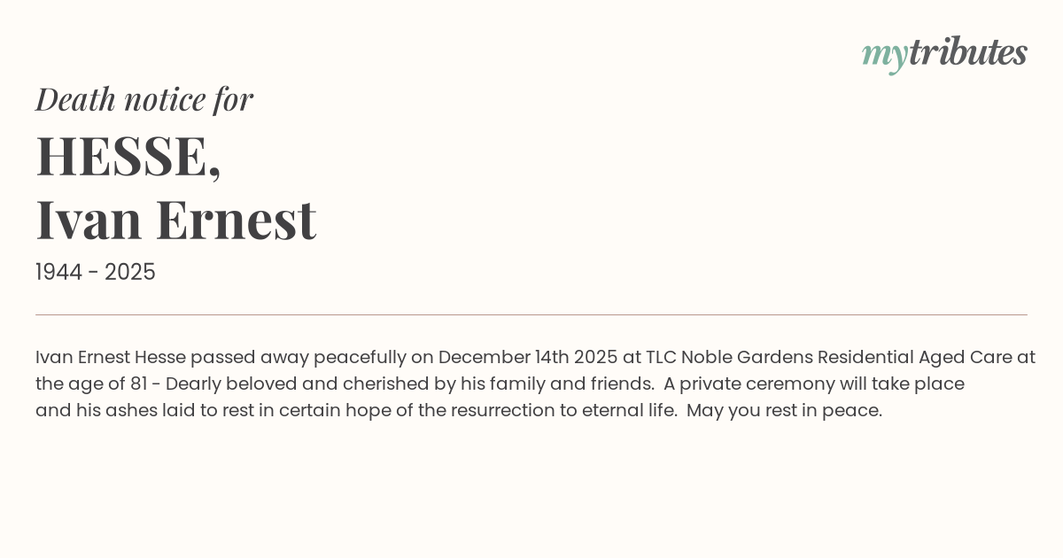 12°CIvan Ernest Hesse passed away peacefully on December 14th 2025 at TLC Noble Gardens Residential Aged Care at the age of 81 - Dearly beloved and cherished by his family and friends. A private ceremony will take place and his ashes laid to rest in certain hope of the resurrection to eternal life. May you rest in peace.