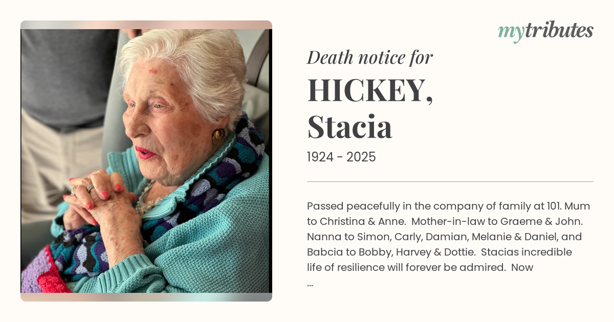 12°CPassed peacefully in the company of family at 101. Mum to Christina & Anne. Mother-in-law to Graeme & John. Nanna to Simon, Carly, Damian, Melanie & Daniel, and Babcia to Bobby, Harvey & Dottie. Stacia’s incredible life of resilience will forever be admired. Now reunited at rest with Daniel to fall in love all over again.