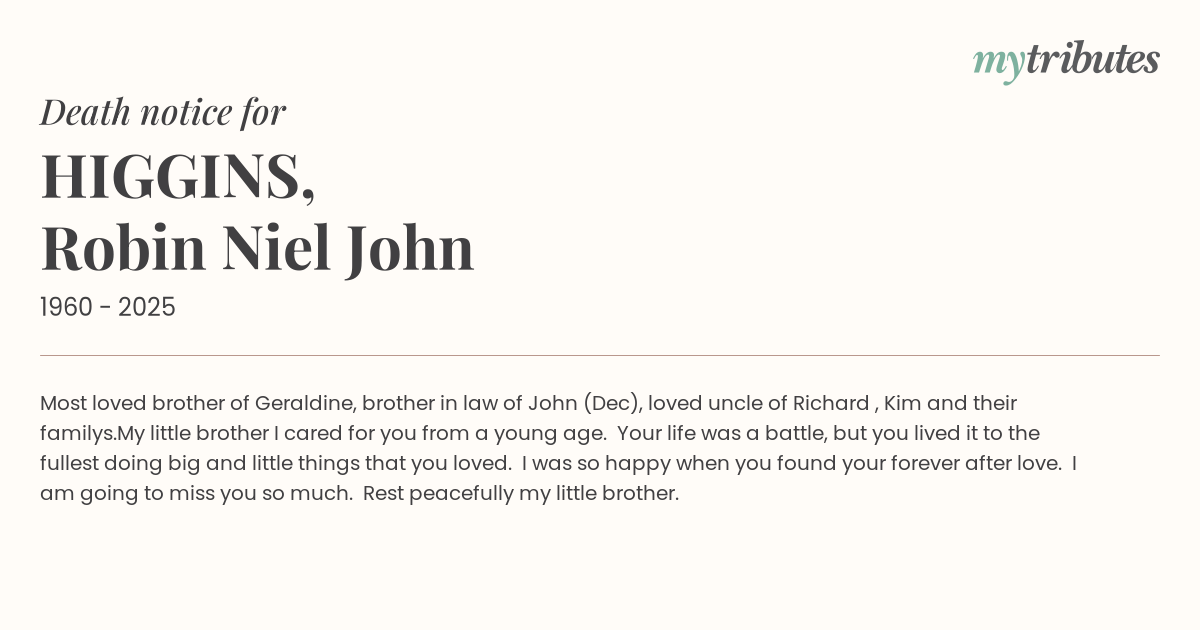 12°CMost loved brother of Geraldine, brother in law of John (Dec), loved uncle of Richard , Kim and their family’s.