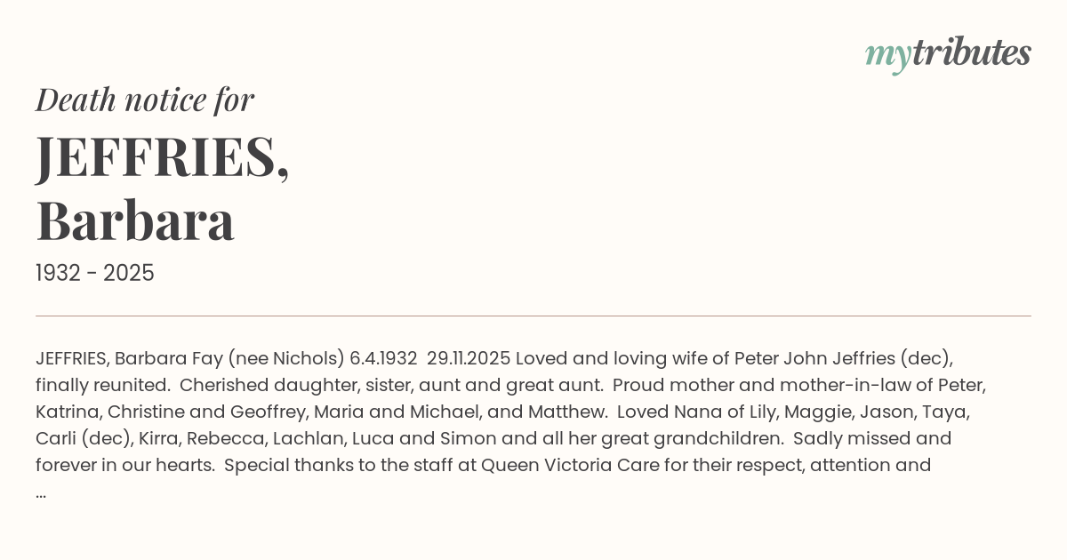 12°CJEFFRIES, Barbara Fay (nee Nichols) 6.4.1932 – 29.11.2025 Loved and loving wife of Peter John Jeffries (dec), finally reunited. Cherished daughter, sister, aunt and great aunt. Proud mother and mother-in-law of Peter, Katrina, Christine and Geoffrey, Maria and Michael, and Matthew. Loved Nana of Lily, Maggie, Jason, Taya, Carli (dec), Kirra, Rebecca, Lachlan, Luca and Simon and all her great grandchildren. Sadly missed and forever in our hearts. Special thanks to the staff at Queen Victoria Care for their respect, attention and dedication.