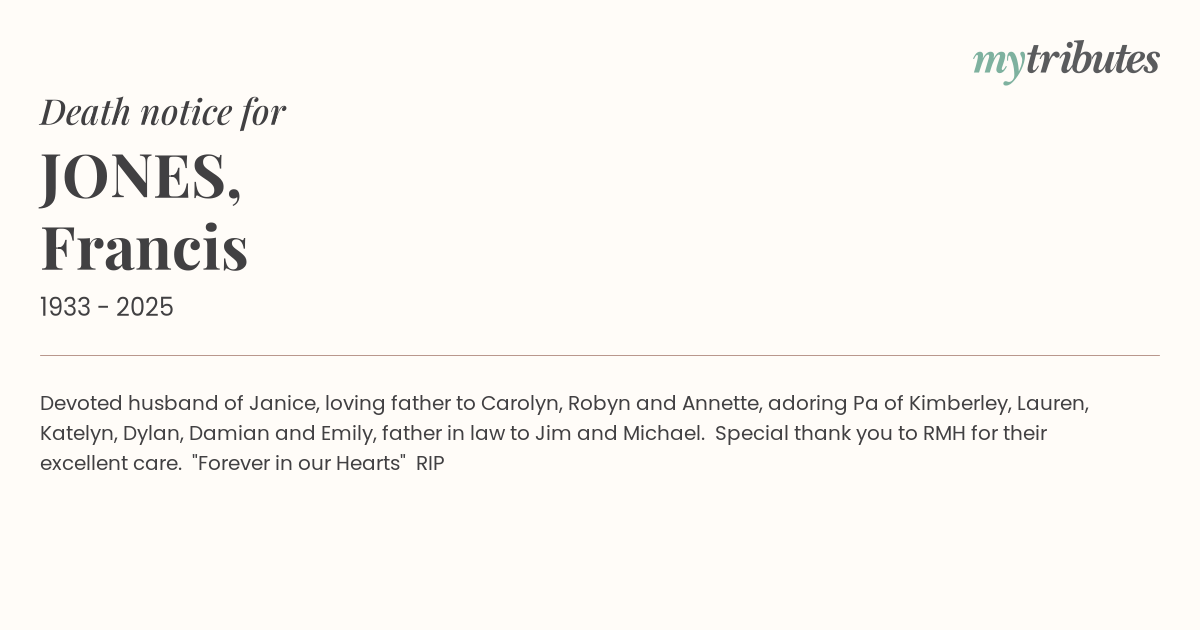12°CDevoted husband of Janice, loving father to Carolyn, Robyn and Annette, adoring Pa of Kimberley, Lauren, Katelyn, Dylan, Damian and Emily, father in law to Jim and Michael. Special thank you to RMH for their excellent care. "Forever in our Hearts" RIP
