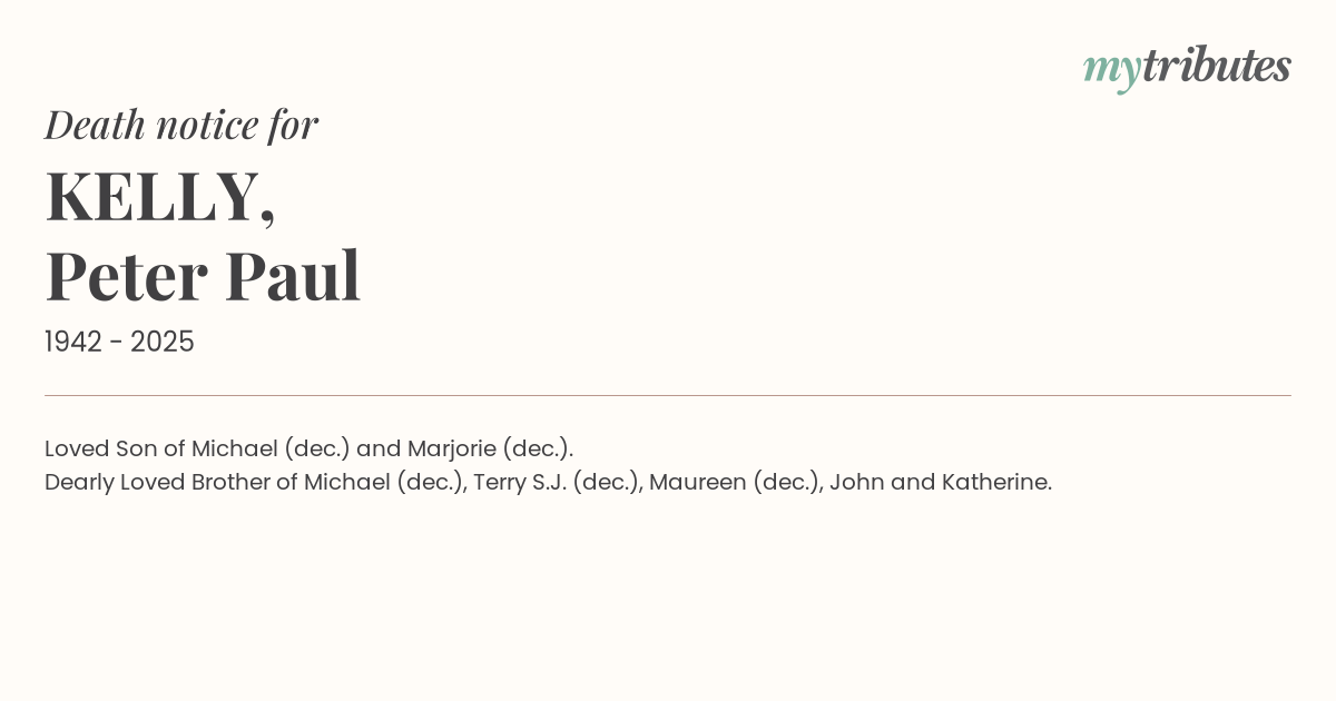 Dearly Loved Brother of Michael (dec.), Terry S.J. (dec.), Maureen (dec.), John and Katherine.