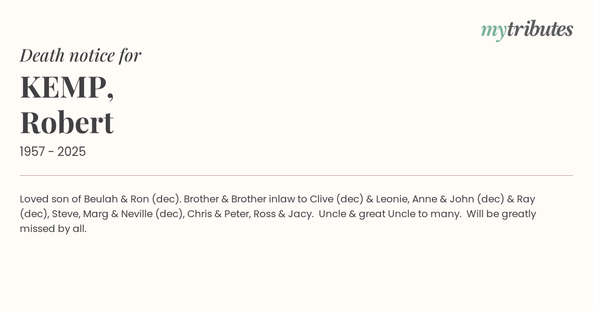 12°CLoved son of Beulah & Ron (dec). Brother & Brother inlaw to Clive (dec) & Leonie, Anne & John (dec) & Ray (dec), Steve, Marg & Neville (dec), Chris & Peter, Ross & Jacy. Uncle & great Uncle to many. Will be greatly missed by all.