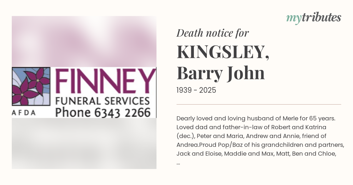 12°CDearly loved and loving husband of Merle for 65 years. Loved dad and father-in-law of Robert and Katrina (dec.), Peter and Maria, Andrew and Annie, friend of Andrea.