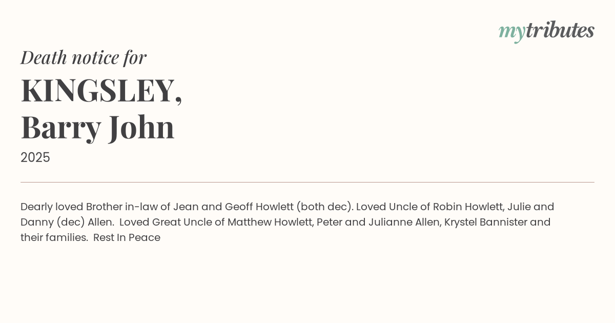 12°CDearly loved Brother in-law of Jean and Geoff Howlett (both dec). Loved Uncle of Robin Howlett, Julie and Danny (dec) Allen. Loved Great Uncle of Matthew Howlett, Peter and Julianne Allen, Krystel Bannister and their families.