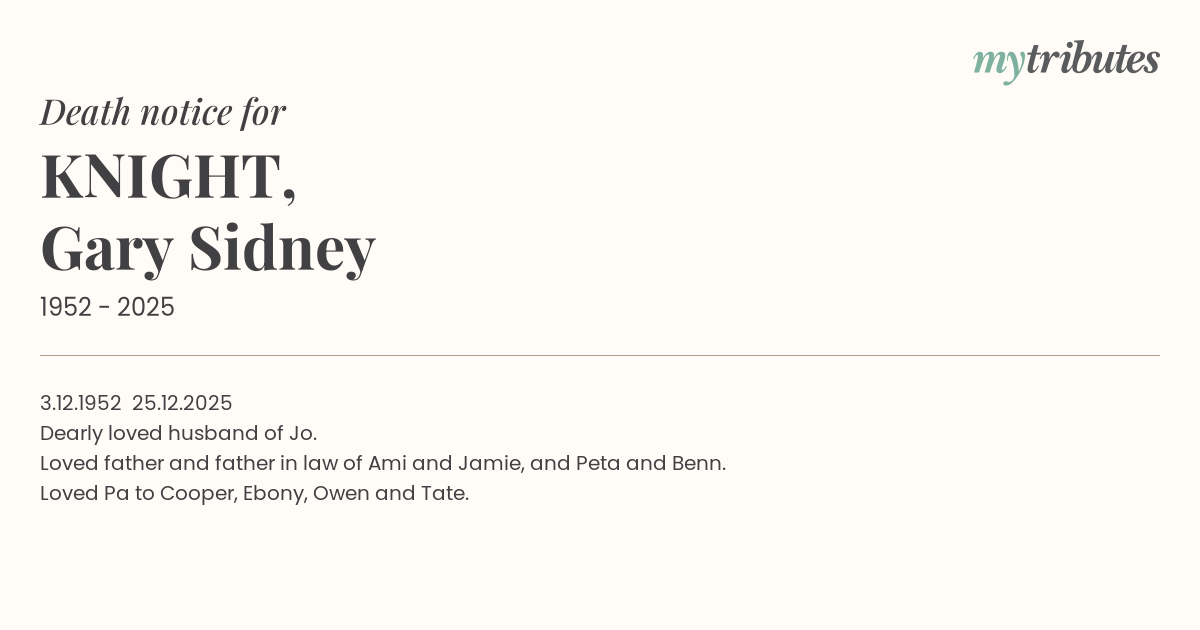 Loved father and father in law of Ami and Jamie, and Peta and Benn.