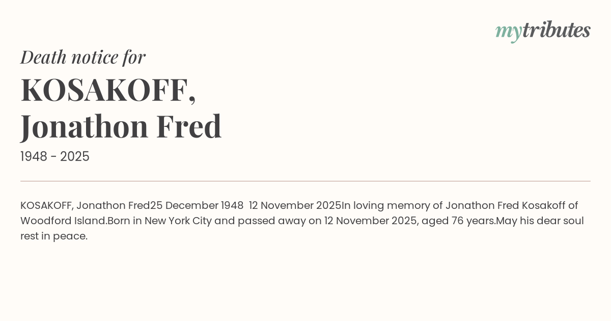 In loving memory of Jonathon Fred Kosakoff of Woodford Island.
