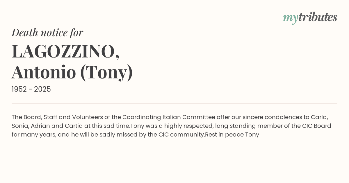 12°CThe Board, Staff and Volunteers of the Coordinating Italian Committee offer our sincere condolences to Carla, Sonia, Adrian and Cartia at this sad time.