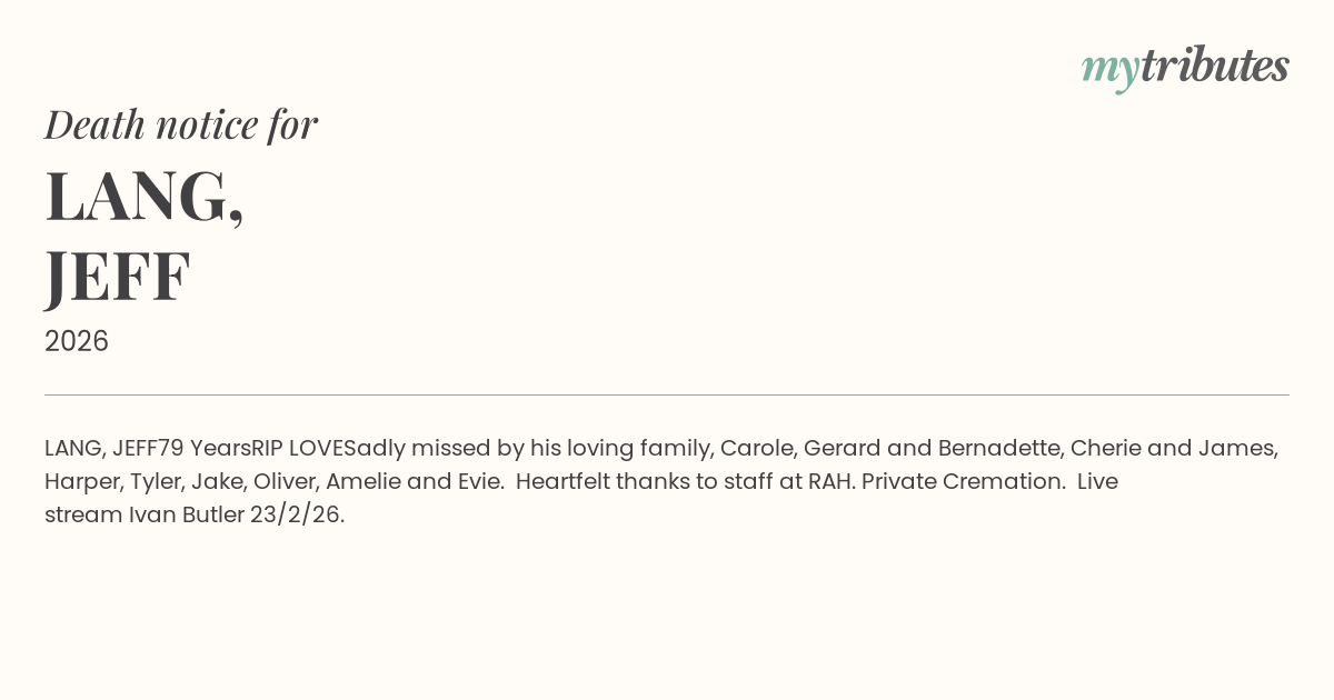 Sadly missed by his loving family, Carole, Gerard and Bernadette, Cherie and James, Harper, Tyler, Jake, Oliver, Amelie and Evie. Heartfelt thanks to staff at RAH. Private Cremation. Live stream Ivan Butler 23/2/26.