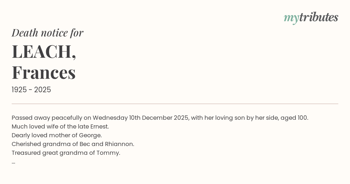 12°CPassed away peacefully on Wednesday 10th December 2025, with her loving son by her side, aged 100.
