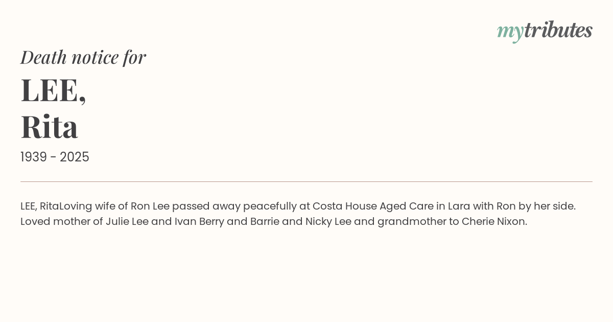 Loving wife of Ron Lee passed away peacefully at Costa House Aged Care in Lara with Ron by her side. Loved mother of Julie Lee and Ivan Berry and Barrie and Nicky Lee and grandmother to Cherie Nixon.