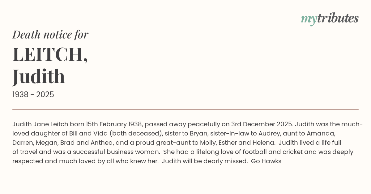 12°CJudith Jane Leitch born 15th February 1938, passed away peacefully on 3rd December 2025. Judith was the much-loved daughter of Bill and Vida (both deceased), sister to Bryan, sister-in-law to Audrey, aunt to Amanda, Darren, Megan, Brad and Anthea, and a proud great-aunt to Molly, Esther and Helena. Judith lived a life full of travel and was a successful business woman. She had a lifelong love of football and cricket and was deeply respected and much loved by all who knew her. Judith will be dearly missed. Go Hawks