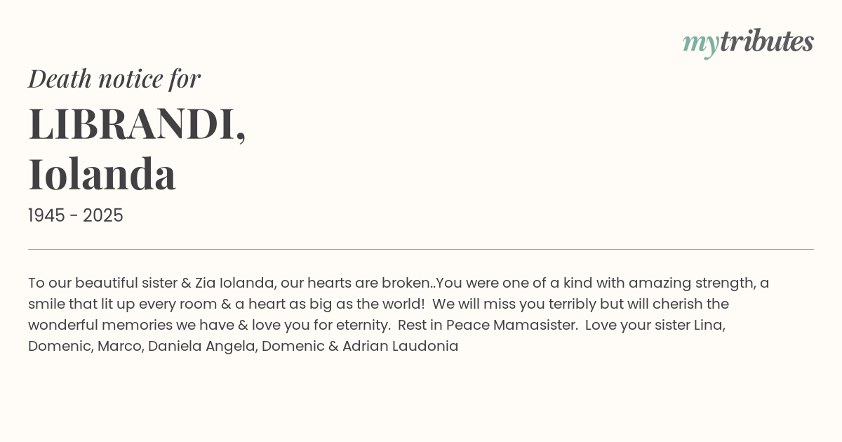 12°CTo our beautiful sister & Zia Iolanda, our hearts are broken..You were one of a kind with amazing strength, a smile that lit up every room & a heart as big as the world! We will miss you terribly but will cherish the wonderful memories we have & love you for eternity. Rest in Peace Mamasister. Love your sister Lina, Domenic, Marco, Daniela Angela, Domenic & Adrian Laudonia ♥️