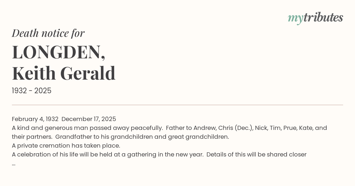 A kind and generous man passed away peacefully. Father to Andrew, Chris (Dec.), Nick, Tim, Prue, Kate, and their partners. Grandfather to his grandchildren and great grandchildren.