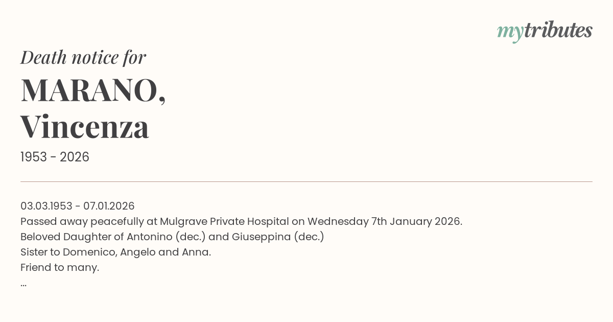 Passed away peacefully at Mulgrave Private Hospital on Wednesday 7th January 2026.