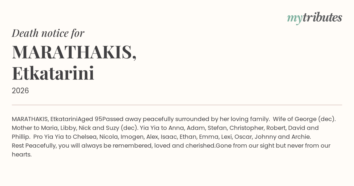Passed away peacefully surrounded by her loving family. Wife of George (dec). Mother to Maria, Libby, Nick and Suzy (dec). Yia Yia to Anna, Adam, Stefan, Christopher, Robert, David and Phillip. Pro Yia Yia to Chelsea, Nicola, Imogen, Alex, Isaac, Ethan, Emma, Lexi, Oscar, Johnny and Archie. Rest Peacefully, you will always be remembered, loved and cherished.