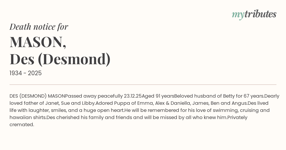 Des cherished his family and friends and will be missed by all who knew him.