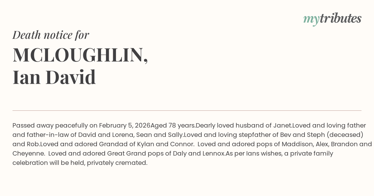 As per Ian’s wishes, a private family celebration will be held, privately cremated.