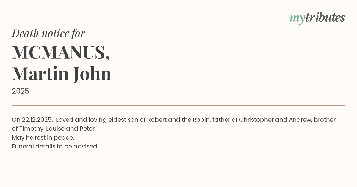 12°COn 22.12.2025. Loved and loving eldest son of Robert and the Robin, father of Christopher and Andrew, brother of Timothy, Louise and Peter.