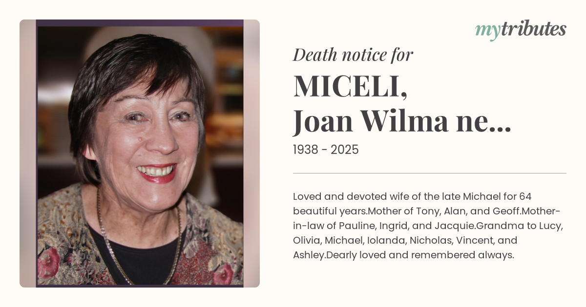 12°CLoved and devoted wife of the late Michael for 64 beautiful years.