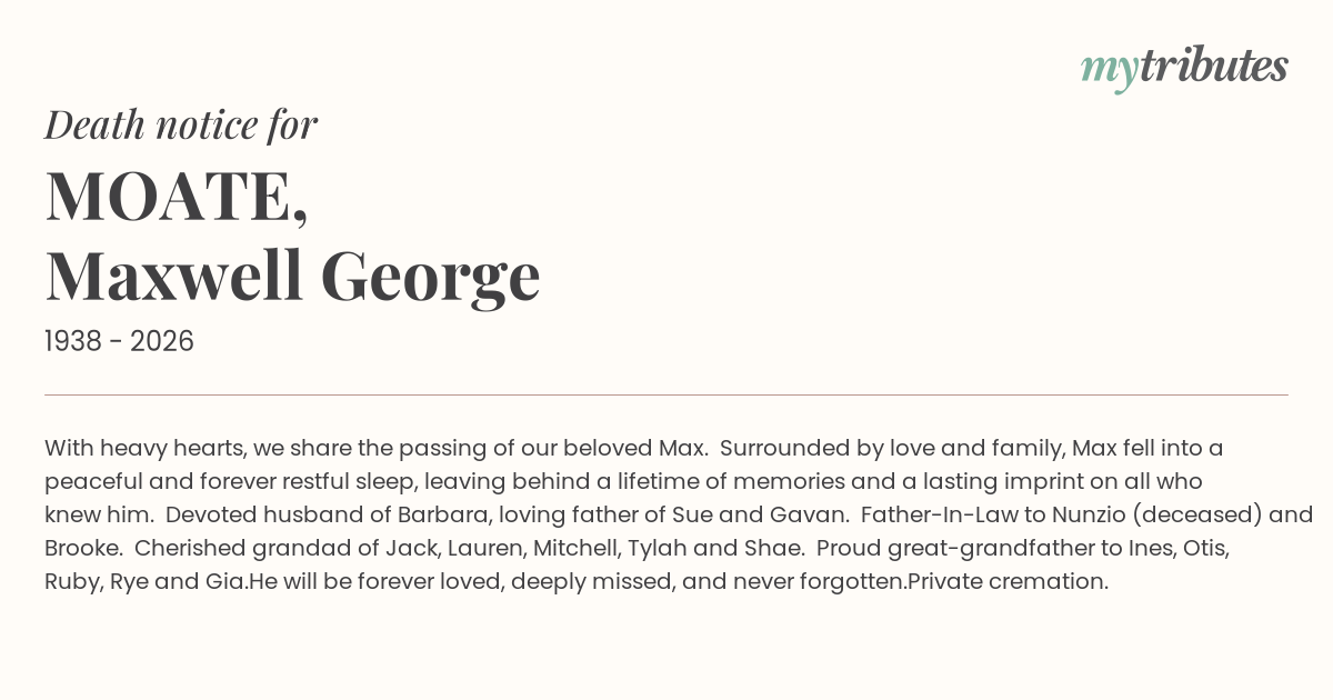 Devoted husband of Barbara, loving father of Sue and Gavan. Father-In-Law to Nunzio (deceased) and Brooke. Cherished grandad of Jack, Lauren, Mitchell, Tylah and Shae. Proud great-grandfather to Ines, Otis, Ruby, Rye and Gia.