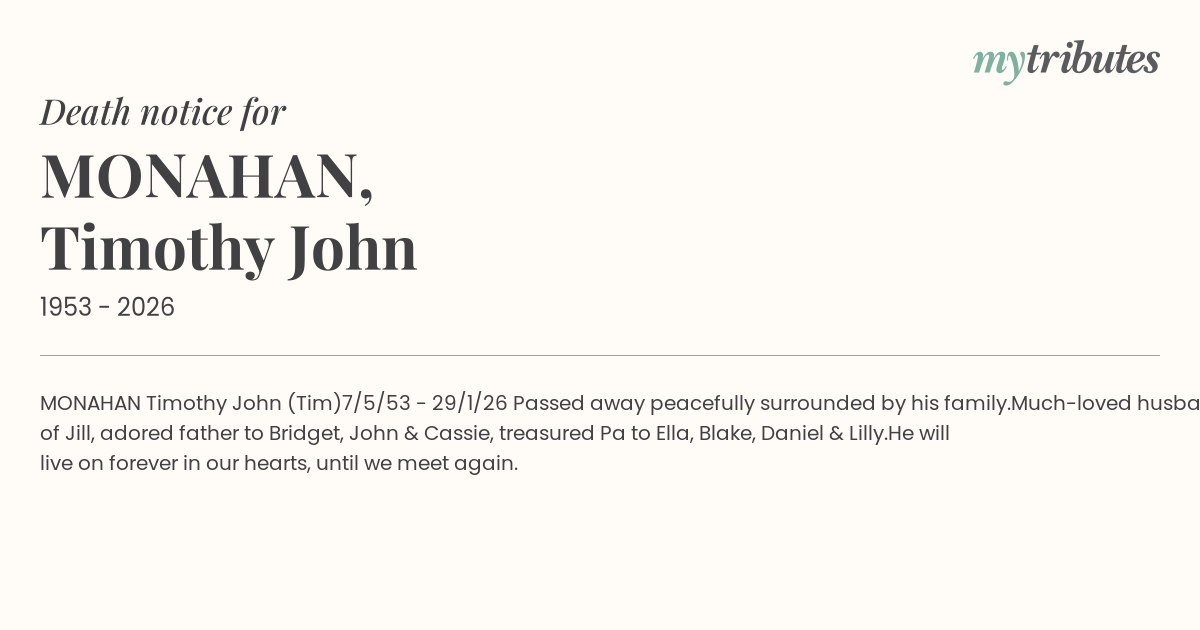 Much-loved husband of Jill, adored father to Bridget, John & Cassie, treasured Pa to Ella, Blake, Daniel & Lilly.