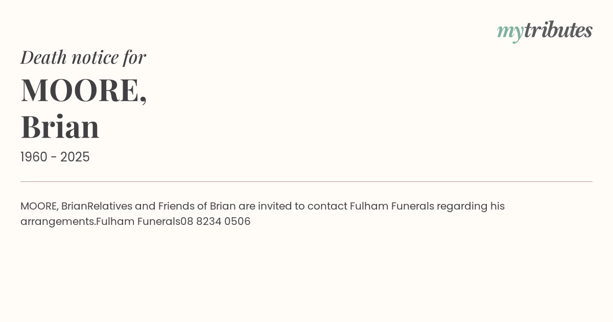 Relatives and Friends of Brian are invited to contact Fulham Funerals regarding