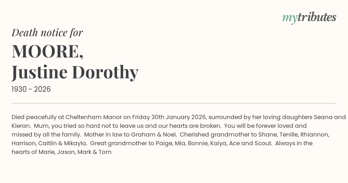 12°CDied peacefully at Cheltenham Manor on Friday 30th January 2026, surrounded by her loving daughters Seana and Kieran. Mum, you tried so hard not to leave us and our hearts are broken. You will be forever loved and missed by all the family. Mother in law to Graham & Noel. Cherished grandmother to Shane, Tenille, Rhiannon, Harrison, Caitlin & Mikayla. Great grandmother to Paige, Mia, Bonnie, Kaiya, Ace and Scout. Always in the hearts of Marie, Jason, Mark & Tom