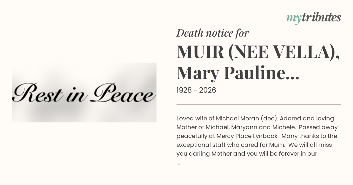 12°CLoved wife of Michael Moran (dec). Adored and loving Mother of Michael, Maryann and Michele. Passed away peacefully at Mercy Place Lynbook. Many thanks to the exceptional staff who cared for Mum. We will all miss you darling Mother and you will be forever in our hearts. We have treasured memories that will last forever. May perpetual light shine on you.
