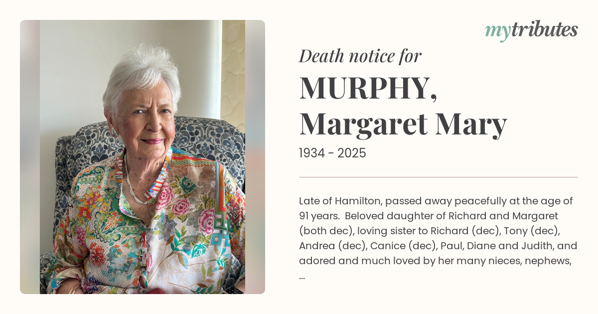 12°CLate of Hamilton, passed away peacefully at the age of 91 years. Beloved daughter of Richard and Margaret (both dec), loving sister to Richard (dec), Tony (dec), Andrea (dec), Canice (dec), Paul, Diane and Judith, and adored and much loved by her many nieces, nephews, great-nieces and great-nephews and their families. Margaret was a loyal friend to so many. All our lives have been enhanced by her love, laughter and generosity, which have been life-giving for all those around her. She loved fiercely and was loved dearly in return. Now with her God. Funeral details to follow.