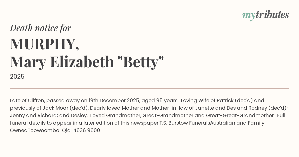 Loving Wife of Patrick (dec'd) and previously of Jack Moar (dec'd). Dearly loved Mother and Mother-in-law of Janette and Des and Rodney (dec'd); Jenny and Richard; and Desley. Loved Grandmother, Great-Grandmother and Great-Great-Grandmother.