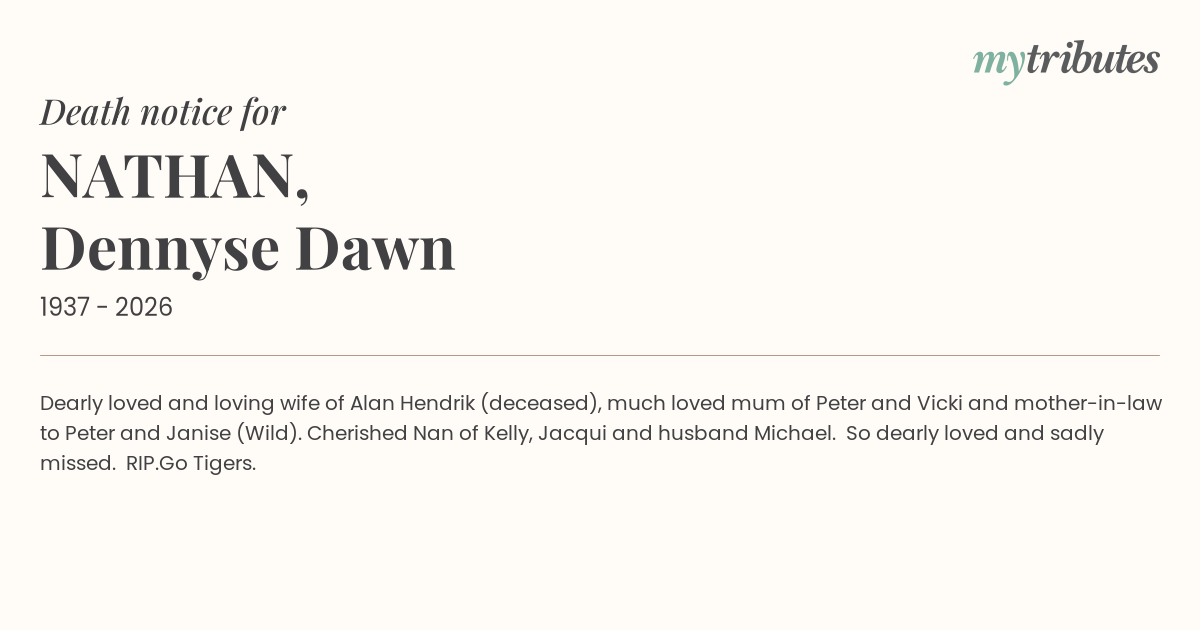 12°CDearly loved and loving wife of Alan Hendrik (deceased), much loved mum of Peter and Vicki and mother-in-law to Peter and Janise (Wild). Cherished Nan of Kelly, Jacqui and husband Michael.