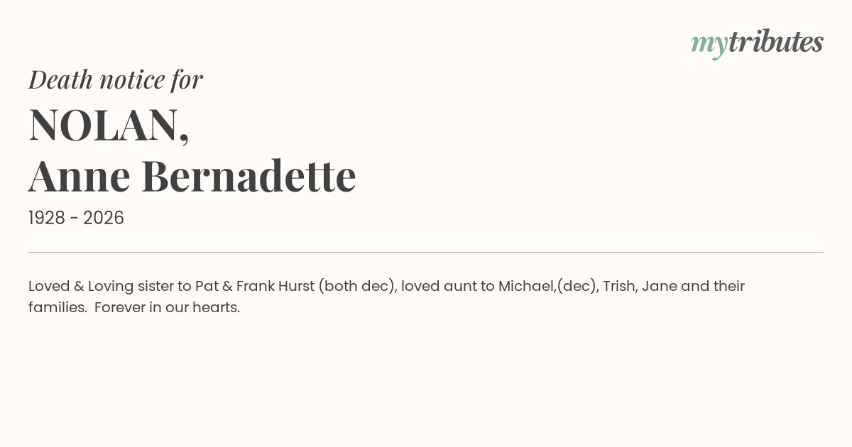12°CLoved & Loving sister to Pat & Frank Hurst (both dec), loved aunt to Michael,(dec), Trish, Jane and their families. Forever in our hearts.