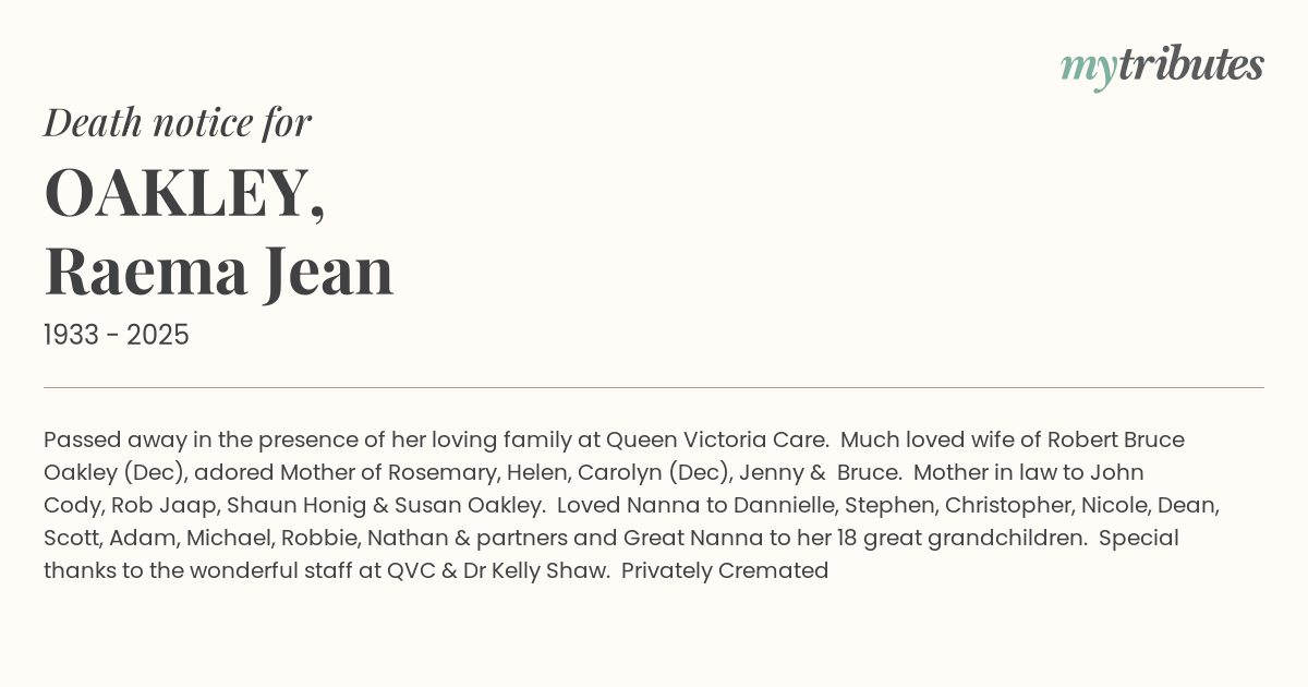 Robert Bruce Oakley (Dec), adored Mother of Rosemary, Helen, Carolyn (Dec), Jenny & Bruce. Mother in law to John Cody, Rob Jaap, Shaun Honig & Susan Oakley. Loved Nanna to Dannielle, Stephen, Christopher, Nicole, Dean, Scott, Adam, Michael, Robbie, Nathan & partners and