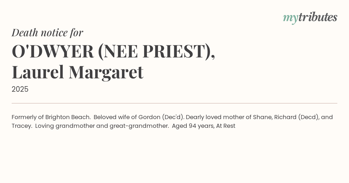 12°CFormerly of Brighton Beach. Beloved wife of Gordon (Dec'd). Dearly loved mother of Shane, Richard (Dec’d), and Tracey. Loving grandmother and great-grandmother. Aged 94 years, At Rest